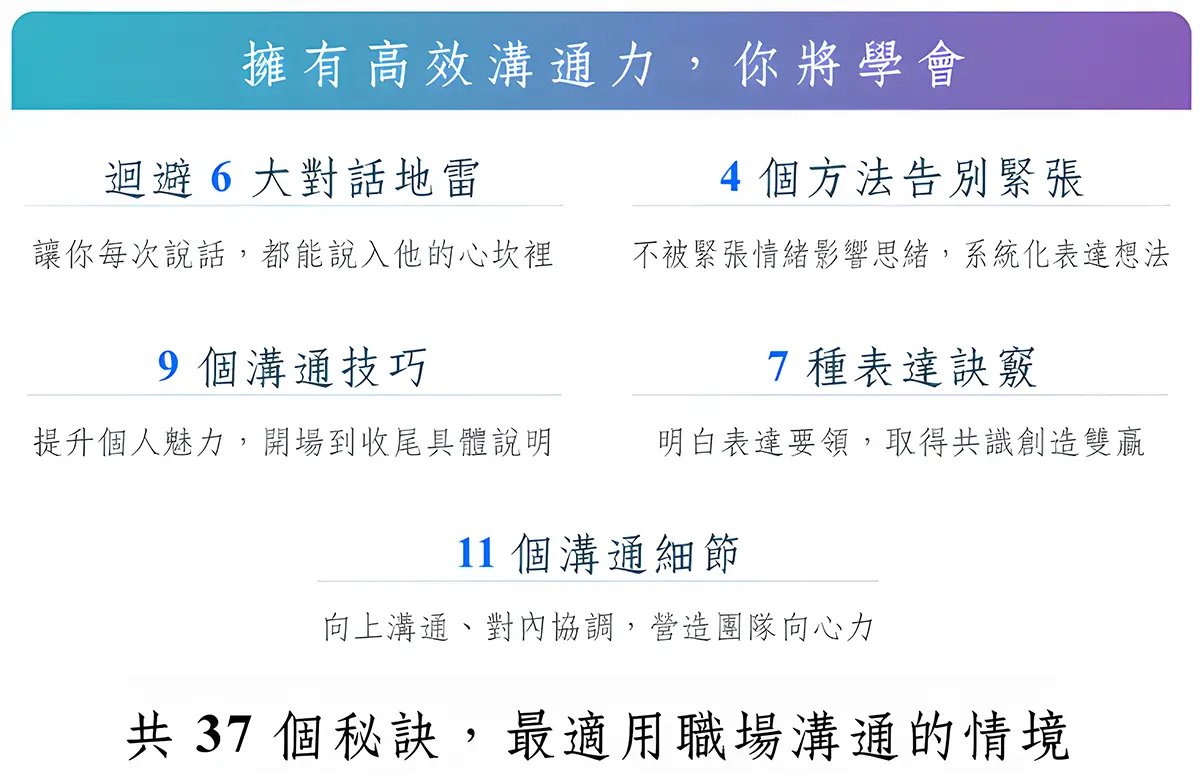 本課程將帶來的是能靈活運用職場對內與對外的溝通中,有效地說話和主動地聆聽的課程。讓學員在學習之後,可以清楚地在面對各式各樣的溝通場景時,能夠高效處理任務分工、情況反饋、誤會障礙等問題。