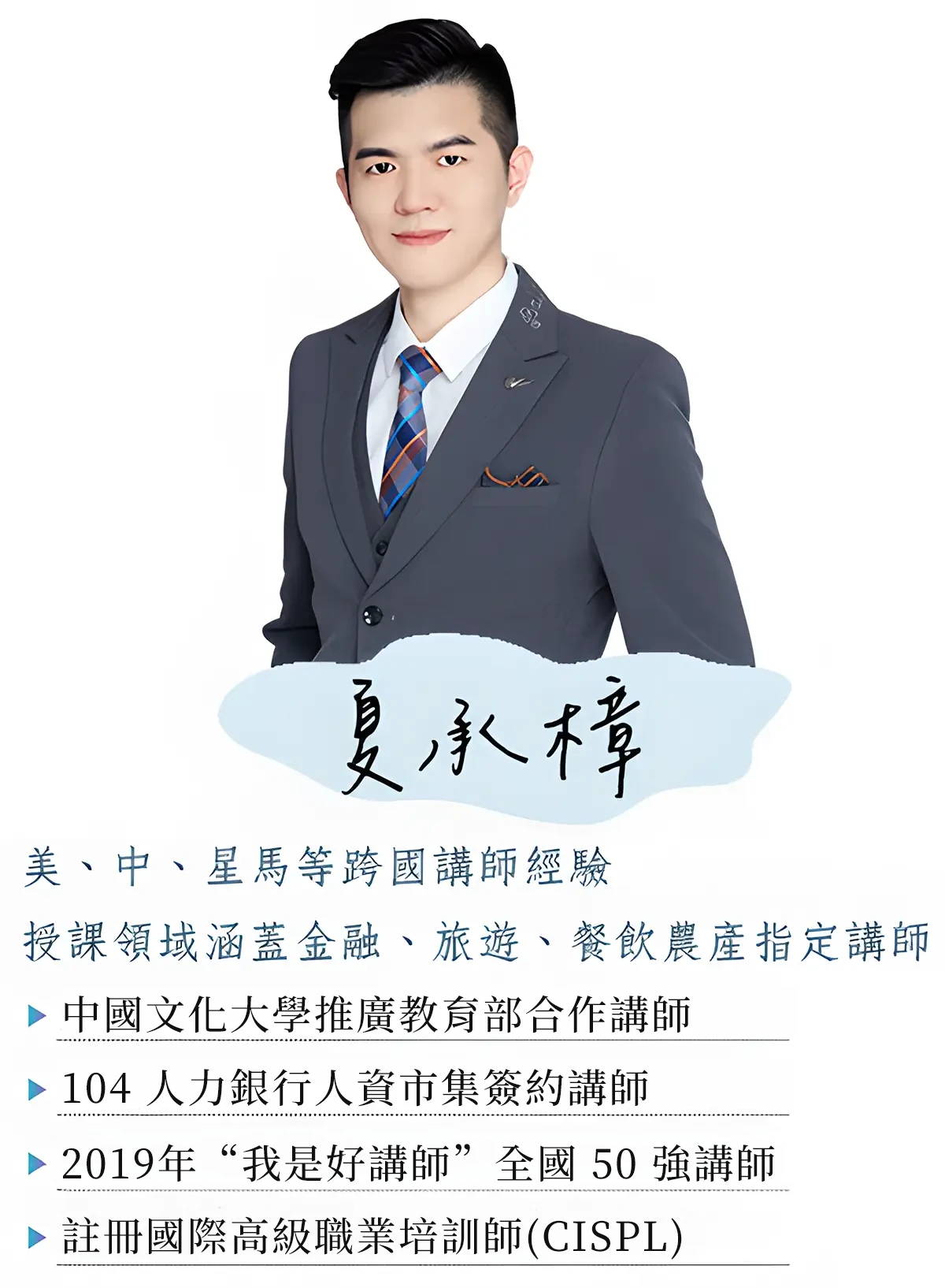 海軍軍官出身,5年軍旅生涯中累積了大量的實戰管理及戰略決策經驗;退役後於跨國英資500強公司擔任全球培訓師,負責全球13個國家的客服中心從0到1建立及培訓輔導,擁有充分的授課及不同文化的溝通管理經驗,總培訓課時約3200課時,培訓學員約達12000人次,學員好評率98.6%。
