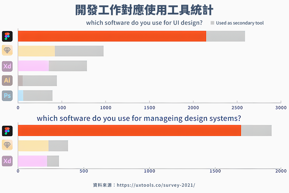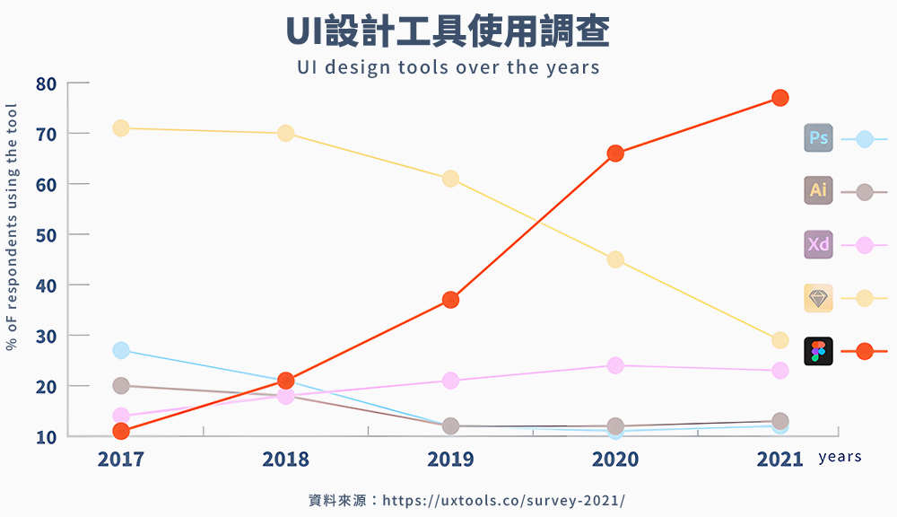 規劃使用者介面的工具繁多,根據UXTOOLS調查,全球設計師使用統計,2021年Figma拿下第一名,在期待榜上也遙遙領先其他工具。設計公司、跨國企業都開始轉用Figma,做為網站與產品介面開發的主要使用軟體。Figma的普及率與未來影響力不容小覷。