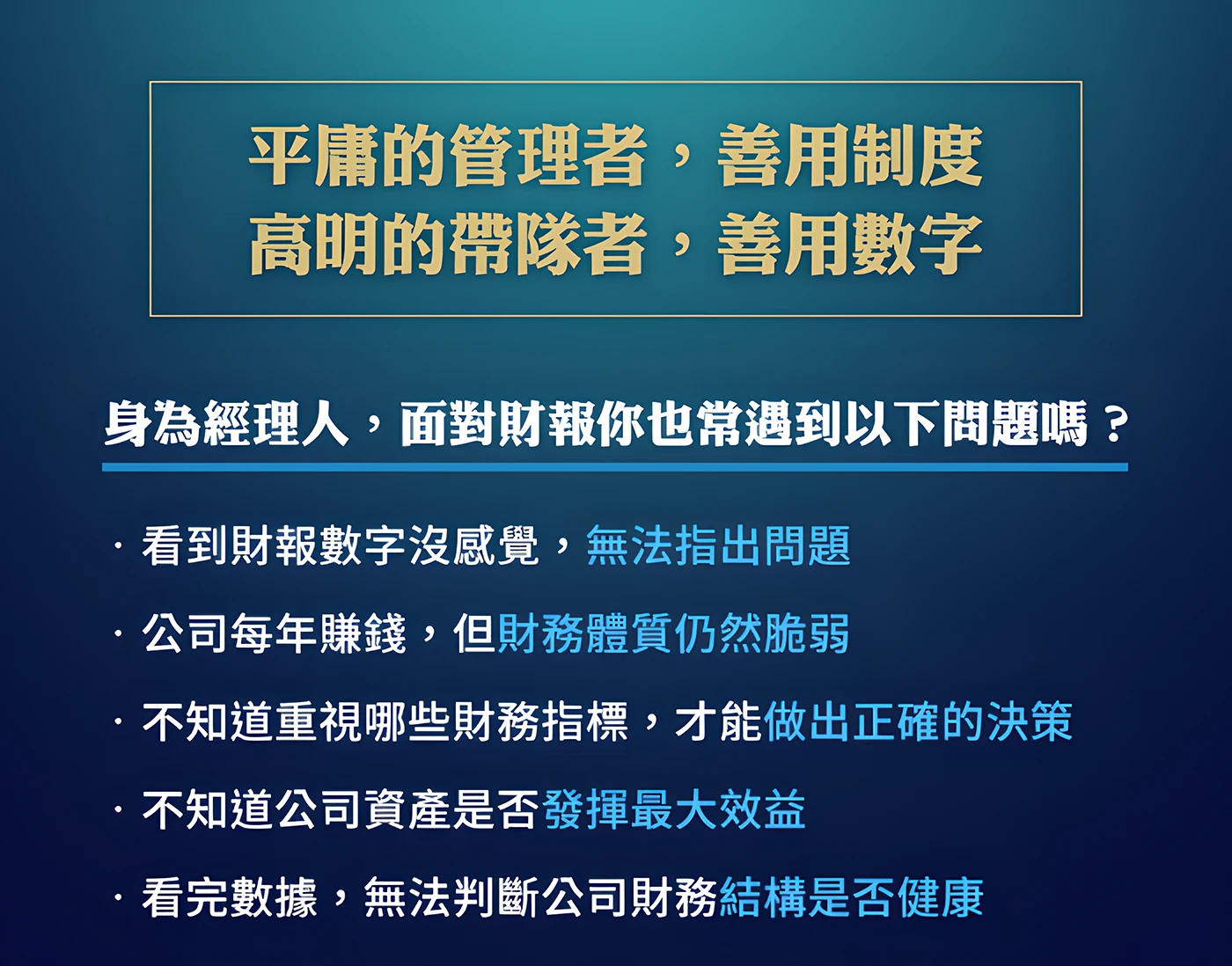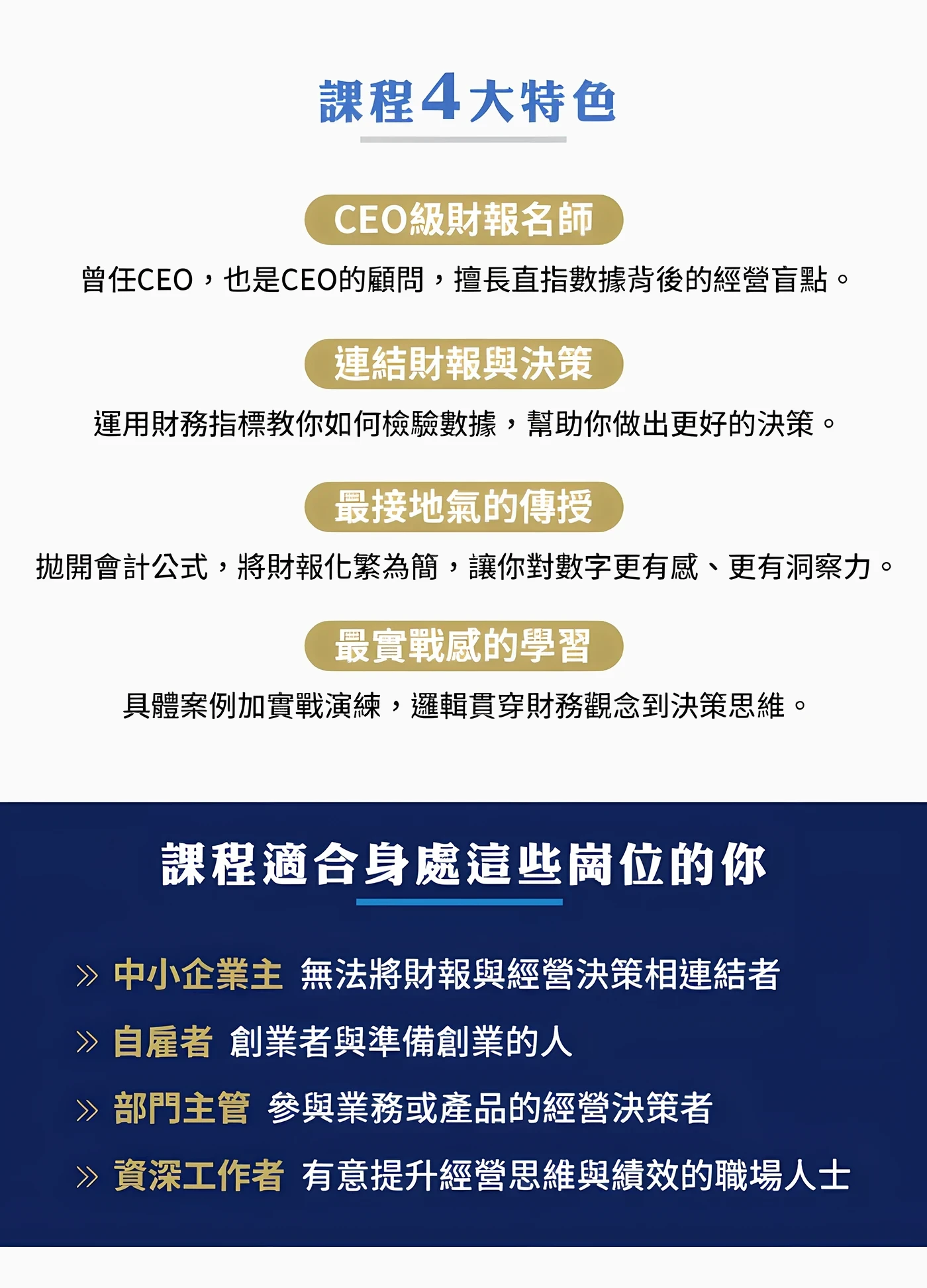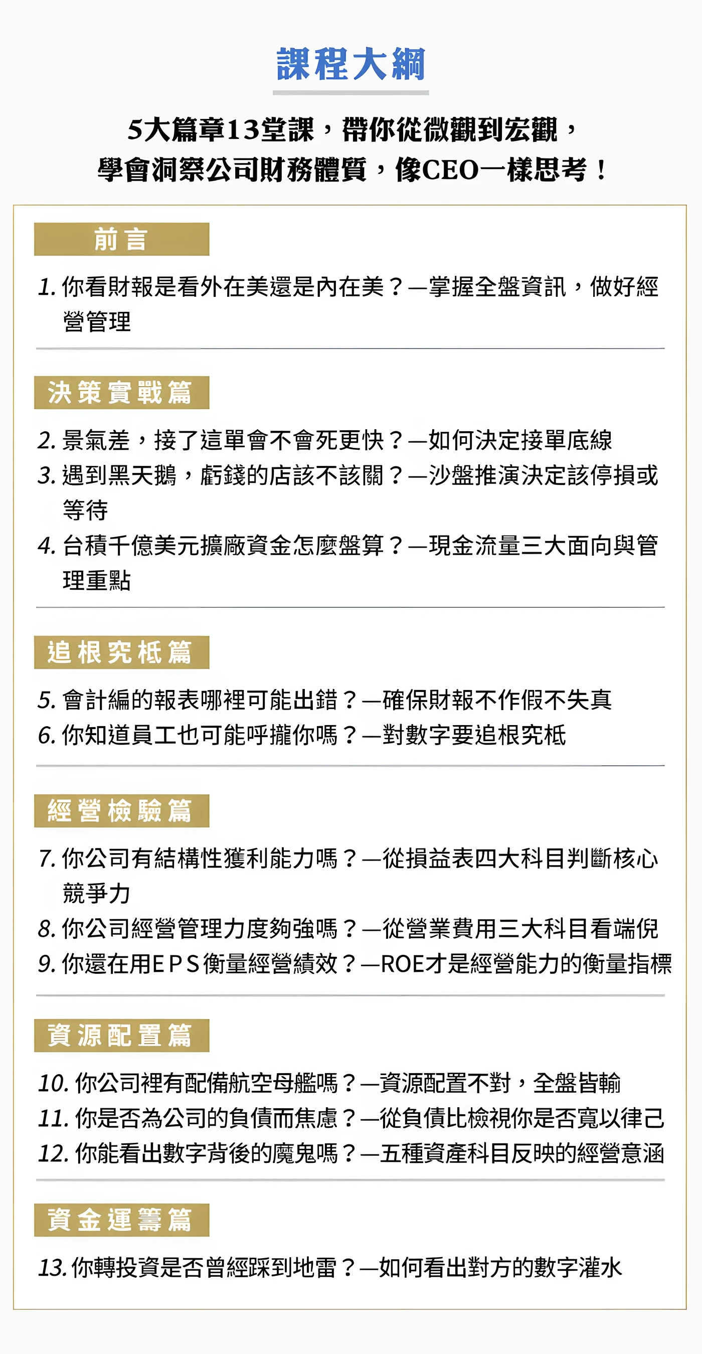本課程將財務三表「白話」化,即便對於會計較為陌生的同學,也能跟著老師了解如何透過財報找到決策關鍵。