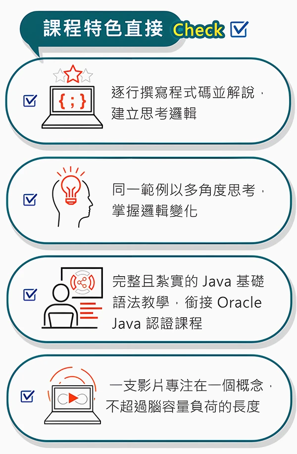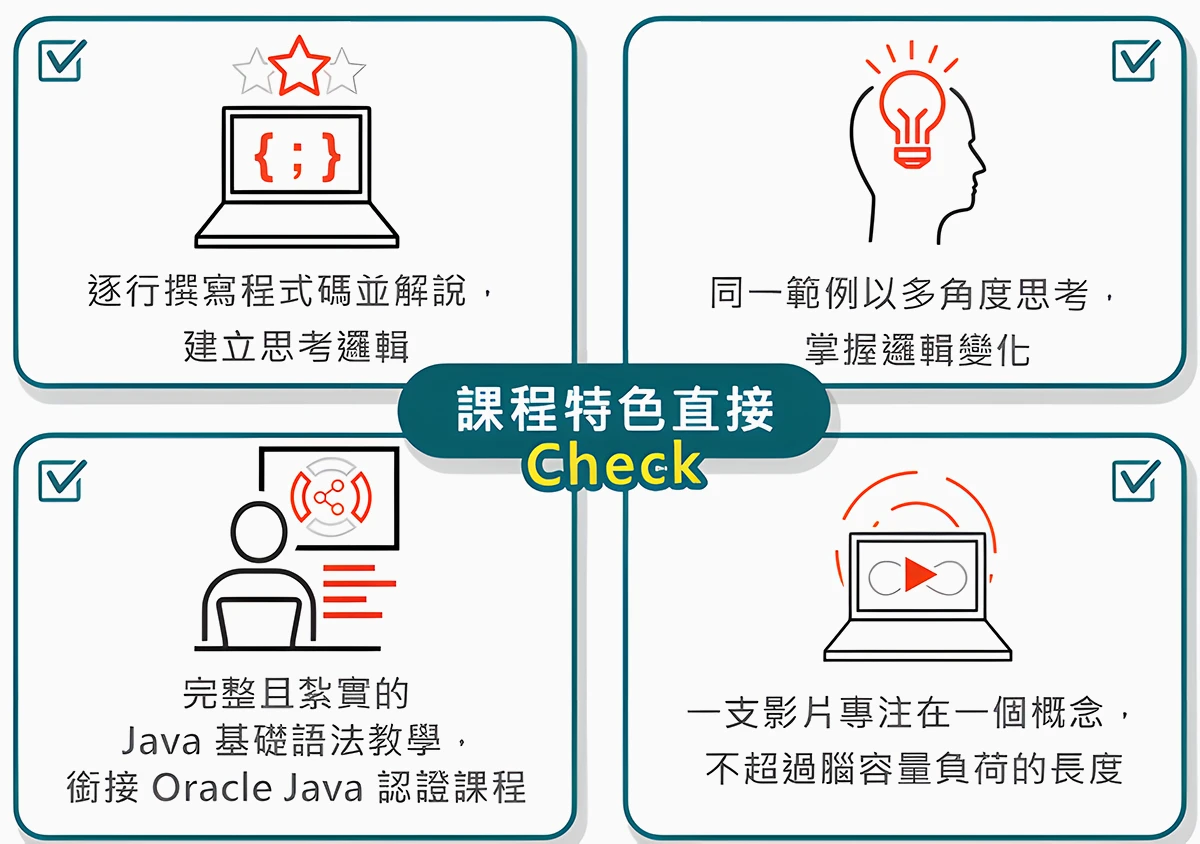 更多關於「程式邏輯」與「Java 基礎語法」的豐富內容,全都收錄在這堂課,建構正確又紮實的程式設計思維,之後深造更容易,立刻開始你的程式之旅吧!