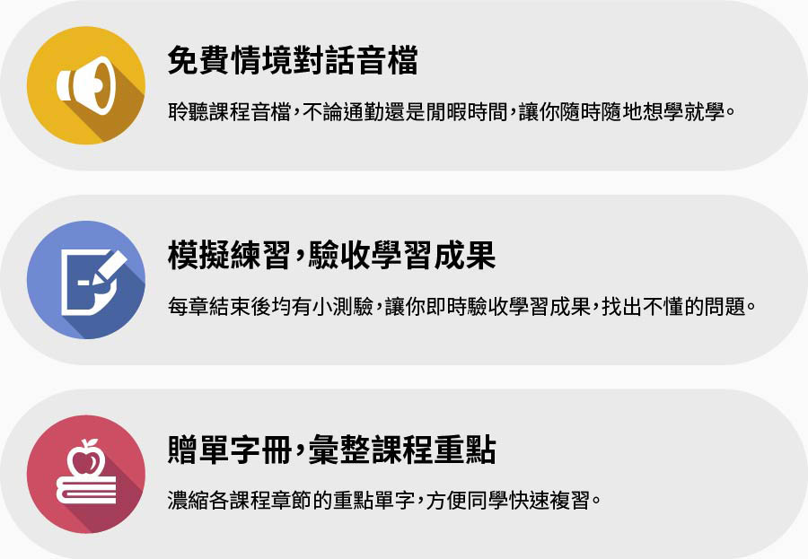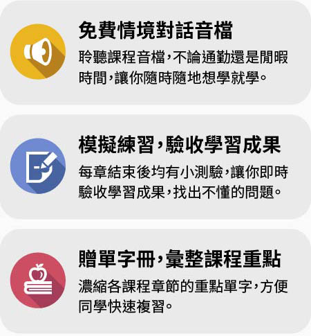 本課程針對弱底的學生特別設計專屬的學習建議,運用情境對話的音檔與課程重點單字,反覆收聽,並同時複習對話重點單字,提升英文語感與流暢度。搭配各章的課後小測驗,保證學習效果UP!