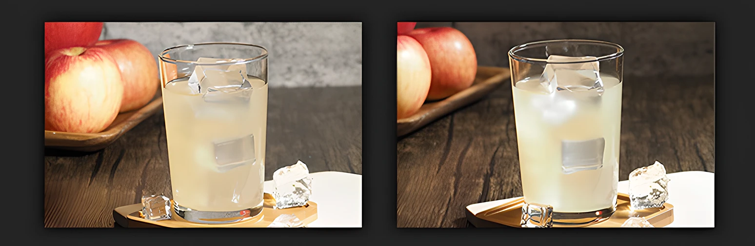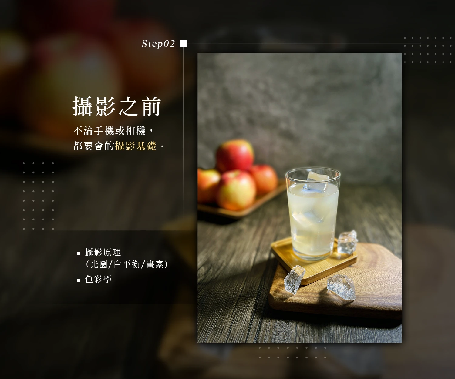 拍攝飲料等液體材質時,拍出飲品的通透感很重要,本章節會利用蘋果汁拍攝做示範,讓你學會掌握液體透光度,讓你的飲品看起來晶瑩剔透、沁涼可口,以及道具搭配的業界小心機。