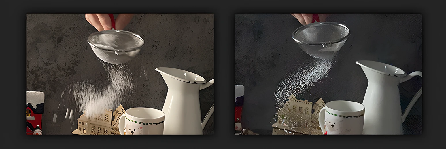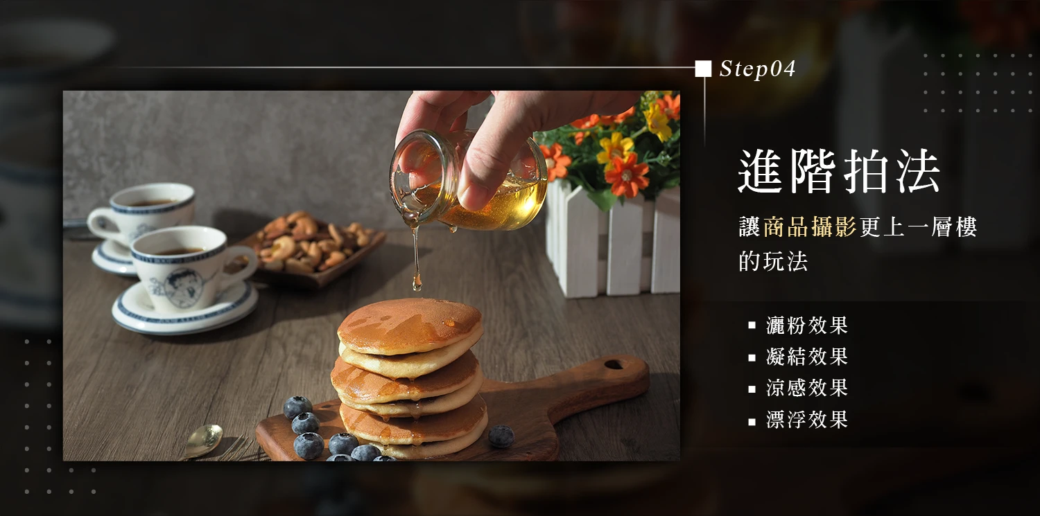靜態的相片拍攝容易、後製也容易;但動態的相片,往往能拍出特別的視覺效果,令照片具生命力,也符合目前的視覺審美,課程會示範拍攝糖粉灑落的瞬間,教你清楚捕捉在半空中的每個顆粒,讓糖粉在空中起舞一樣。