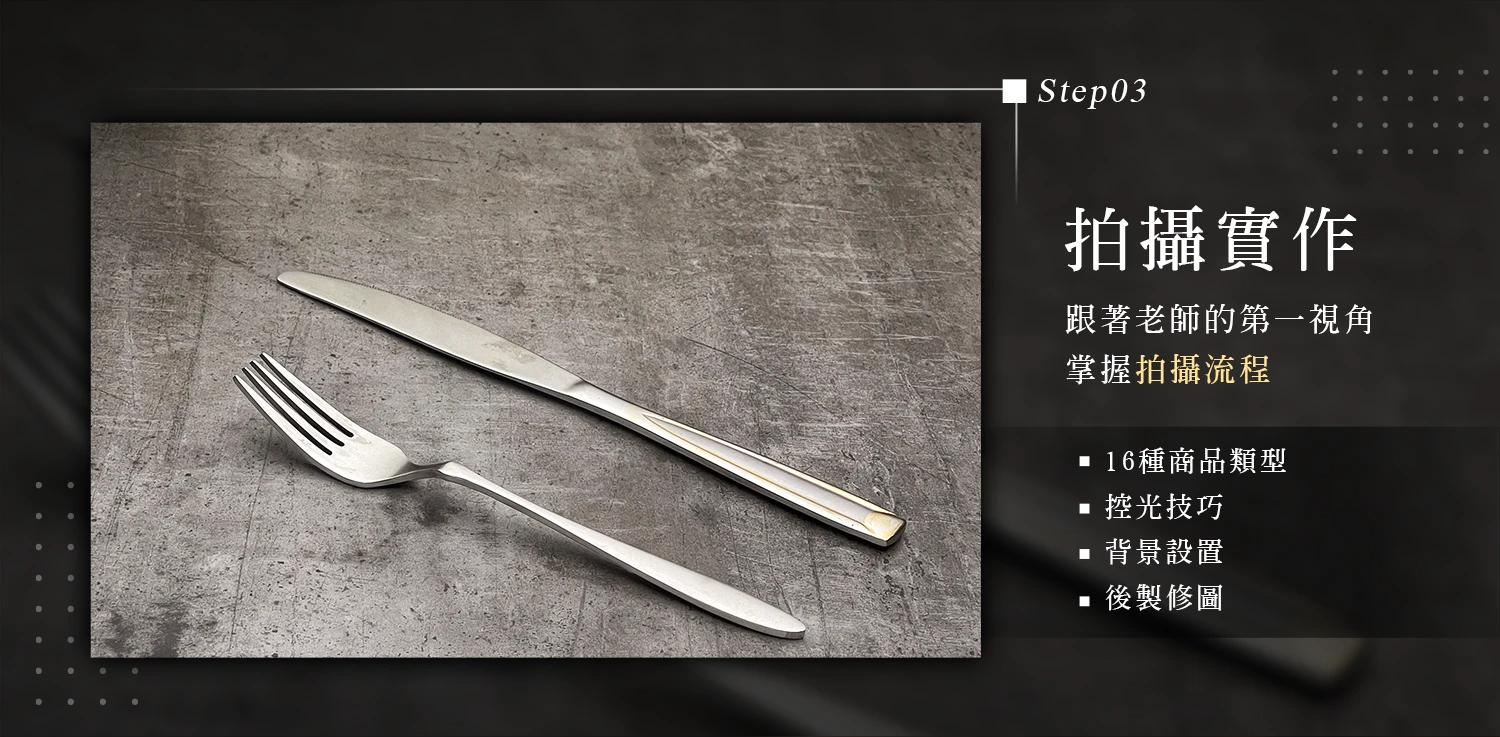 商品攝影最常見的類型,高反光性的金屬材質很容易反射拍攝者,影響產品外觀,課程中將會示範如何整理攝影背景、調整打光角度,讓照片拍起來更有質感。
