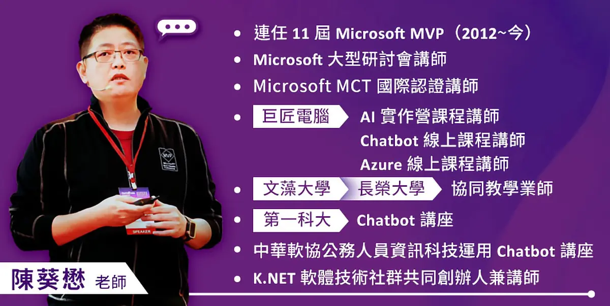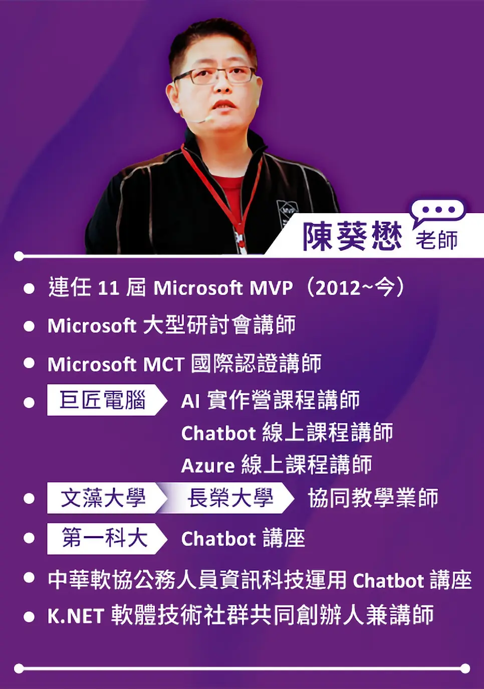陳葵懋老師的專長在 AI 雲端服務應用、Chatbot 對話機器人開發與設計、跨平台手機 APP 開發與設計、C# 程式語言、網頁應用程式開發與設計等範疇,並以 Microsoft 技術為主,在商業應用系統軟體設計與開發領域,累積超過 15 年業界實務經驗,專精於 Chatbot 及 AI 服務結合應用系統、雲端服務、APP 及Web Base 系統架構及開發,並在高雄成立 K.NET 技術社群,分享各種技術議題,擁有 Microsoft MCSA、MCSD、MCP 國際證照,並為 Microsoft Certified Trainer(微軟認證講師)。