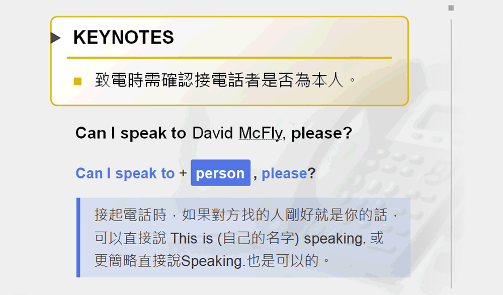 特別針對不熟悉如何接聽英文電話的你設計,強化各種英文電話應答必備能力,幫助你在接聽英文電話的瞬間,立刻就能抓到電話溝通重點。課程也彙整各種常見的電話用語、句型、重點單字和相關文化禮儀,讓你不會因為"講錯話"而感到尷尬。