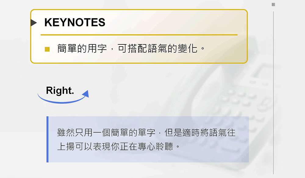 電話溝通因為沒有面對面的肢體和表情輔助,更需要注意口氣以及語調,適當展現禮貌與熱情,才能確保溝通更加得體、清晰,增加與對方電話互動時的信任感、拉近彼此距離。