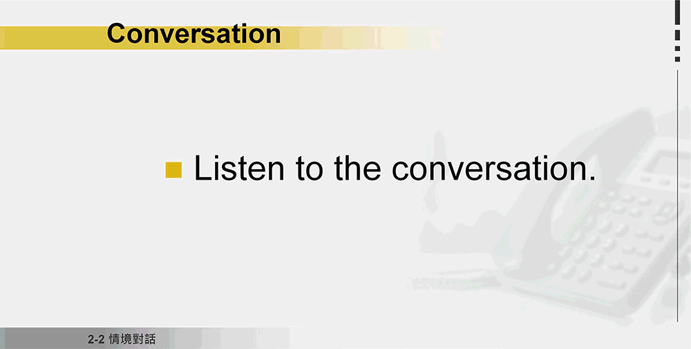 專注訓練聽力,學習如何識別對話重點,課程將會先提供聆聽,再以文字輔助提點對話關鍵,藉由反覆鍛鍊耳力,幫助更好地理解和回應電話溝通遇到的問題與需要。