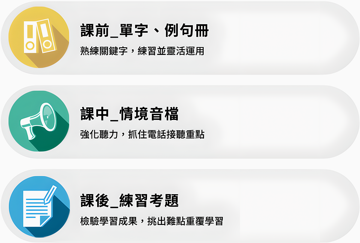 如果你很少接聽英文電話,我們提供多種的對話情境模擬,幫助你預先模擬,了解各種職場英文電話的接聽與播打,使用電話溝通時會遇到的狀況。同時課程也特別規劃遇到訊號不良、內容聽不清楚等突發狀況時,該如何專業又有禮貌地與對方確認內容,排除障礙,解決你面對英文電話的焦慮感。