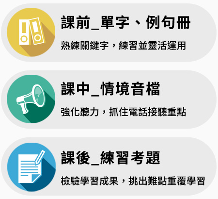 為了幫助學習並提升成果,課程提供重點單字、例句冊、課程音檔、以及課後測驗,幫助同學快速檢視自身學習成效。