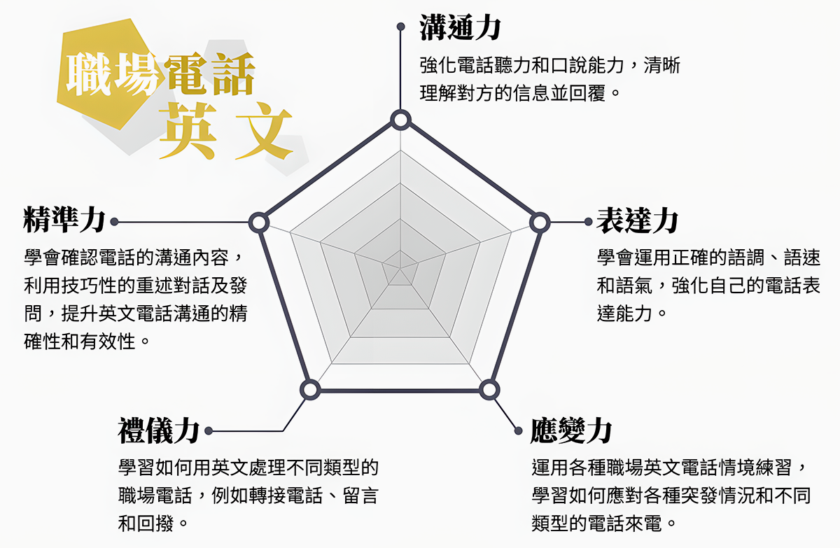 想講好英文電話,不能漫無目的學習,本課程利用點、線、面方法,替學生構築扎實的基底,提高英文學習成效。擺脫坊間學習英文時,因為過讀著重會話,而忽略引導學生如何聽懂電話內容的缺陷。