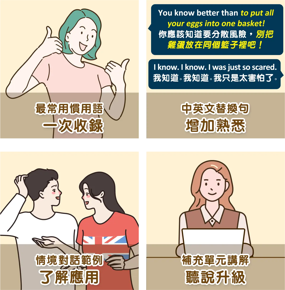 老師為大家精選近年文章報導與生活中最頻繁使用的慣用語,確保學習價值外,也讓你的聽說讀寫,更接地氣。