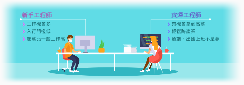 對於新手工程師,軟體開發的入行門檻低,非本科系的軟體工程師大有人在。也就是說,只要有心,不論透過自學或是去上課,人人都能成為軟體工程師。