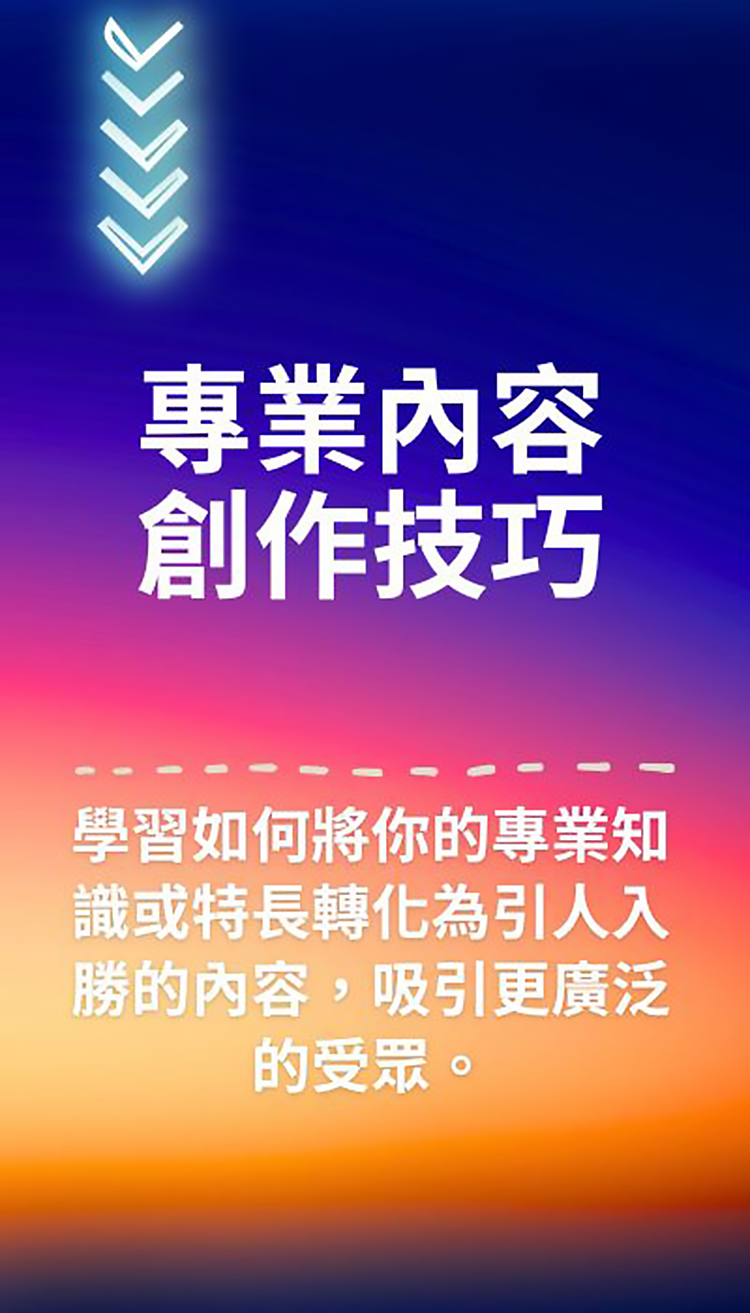 如果你是某個特定領域的專家,擁有獨特的技能、知識或經驗,但尚未在短影音平台上建立起自己的品牌,這個課程將為你提供一個展現的舞台。我們將指導你如何將專業知識轉化為易於理解且引人入勝的內容,吸引更多人關注你的專業領域。