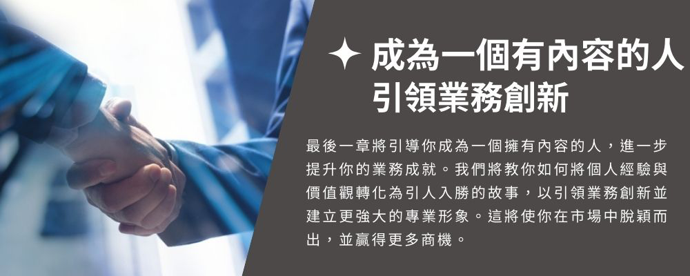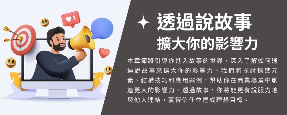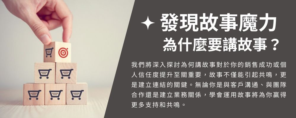 這個課程是你在商業戰場上的秘密武器,無論你是新手還是有經驗的專業人士,『人生必備故事力』課程都將賦予你運用故事創造影響力的力量。立即加入我們,開啟你的『人生必備故事力』之旅,成就你在銷售舞台上的璀璨傳奇!