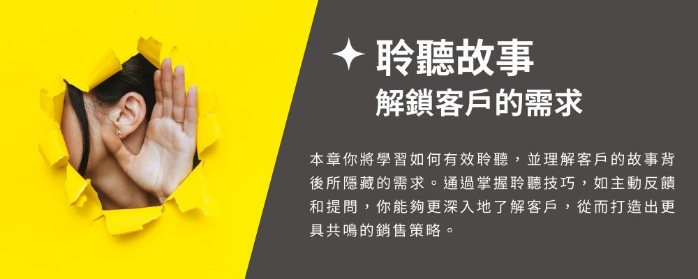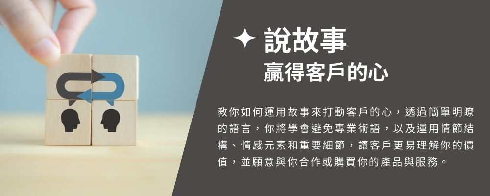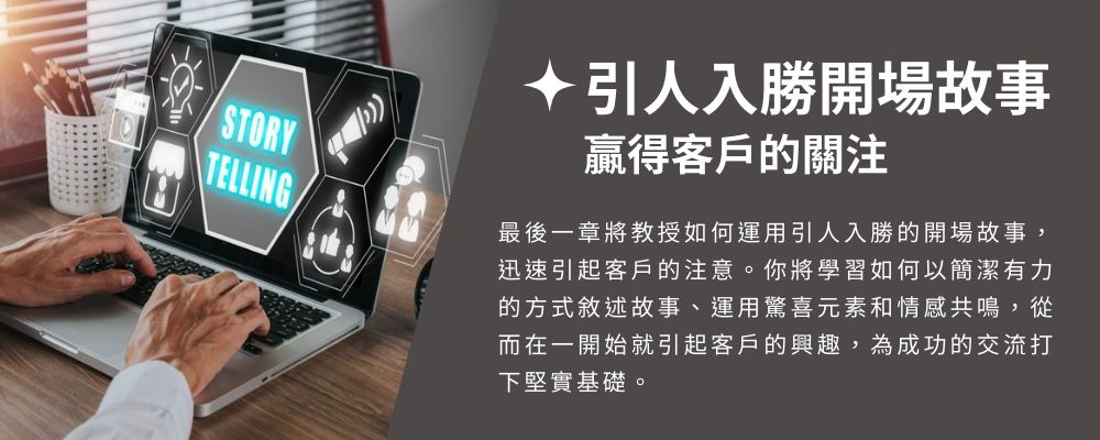 無論你是想提升自己的銷售業績,還是想在業界建立強大的影響力,『成交不斷業務力』課程都將幫助你實現這些目標。不再為成交而煩惱,透過故事的力量,你將能夠贏得客戶的心,打造持久的業務關係。立即觀看課程,開始你的『成交不斷業務力』之旅,成為引領銷售領域的巨星!