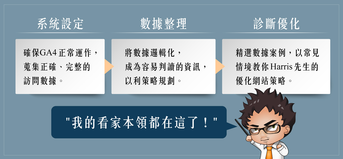 Harris先生希望帶你掌握GA4的基礎設定和數據取得,並以實際網站數據為講授材料,為日後的經營策略打下堅實的基礎。