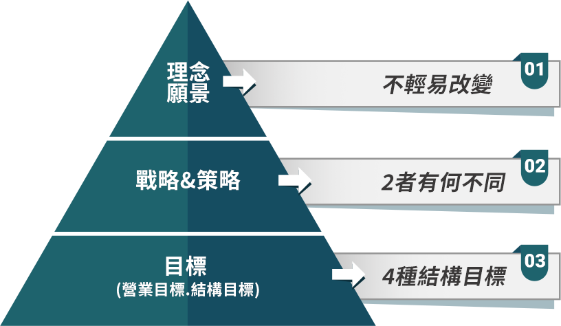 企業經營猶如一個金字塔,身為公司的領頭羊,要讓基層到高層同仁,從遠方一望就知道公司的核心目標,不論屬員或公司怎麼航行,都能向著指標前進,不迷茫不瞎忙!管理者要明確公司經營理念和願景,而為了往願景前進,因應產生各種戰略與策略,當所有的行動有方向後,建議再制定各種短期目標,透過建立企業制度與培養接班團隊,讓目標得以檢核並延續傳承。? 經營管理你是否有一套方法,讓公司不論景氣好壞,都能照著自己的腳步與節奏穩定發展呢?