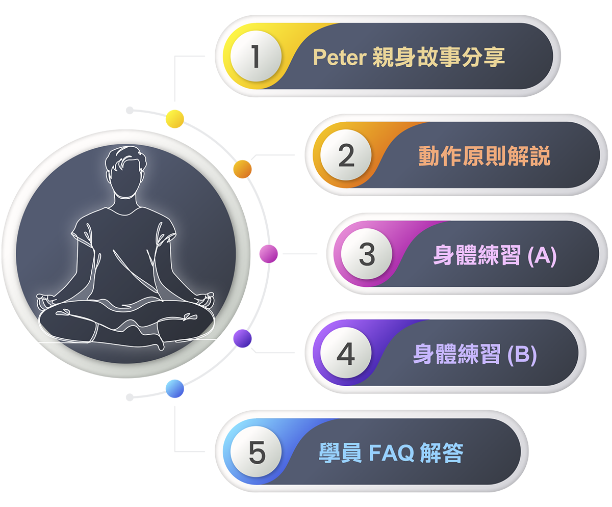 在這門課程中,Peter老師將以自己的親身經歷為開場,讓你感受到瑜珈對健康的深遠影響。此外,老師會詳細解釋每個瑜珈動作的原理,幫助你在學習動作前深入了解這些動作對身體的益處。接下來,你將在溫和且專業的指導下,學會一系列專門針對舒緩腹部不適而設計的瑜珈動作。最後,課程還特別安排了常見問題解答環節,幫助你克服在練習過程中可能遇到的挑戰,確保你能自信地完成每一次的練習。