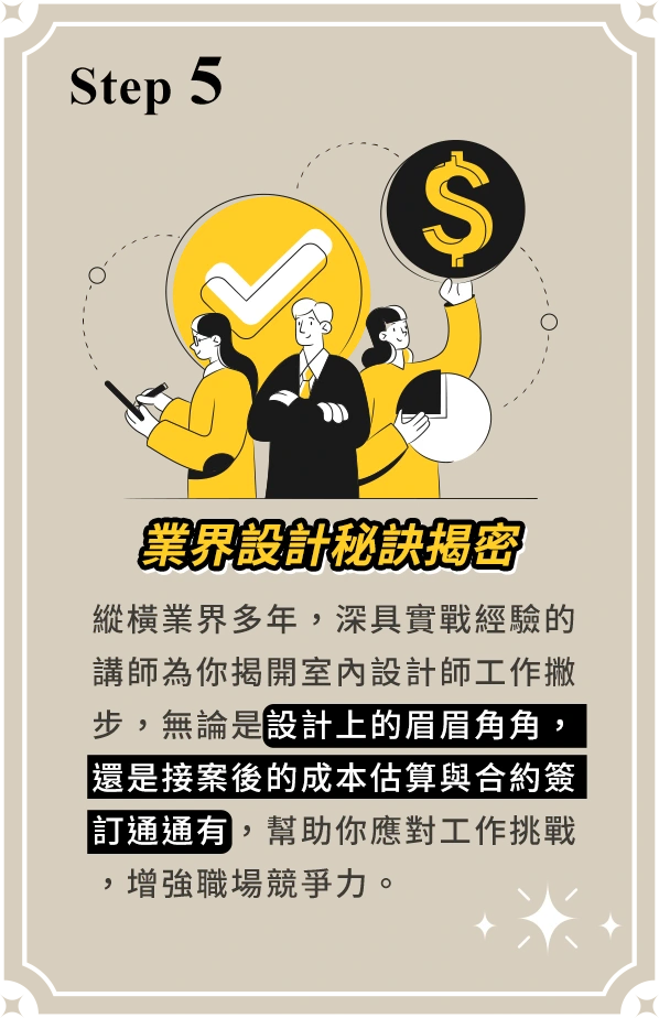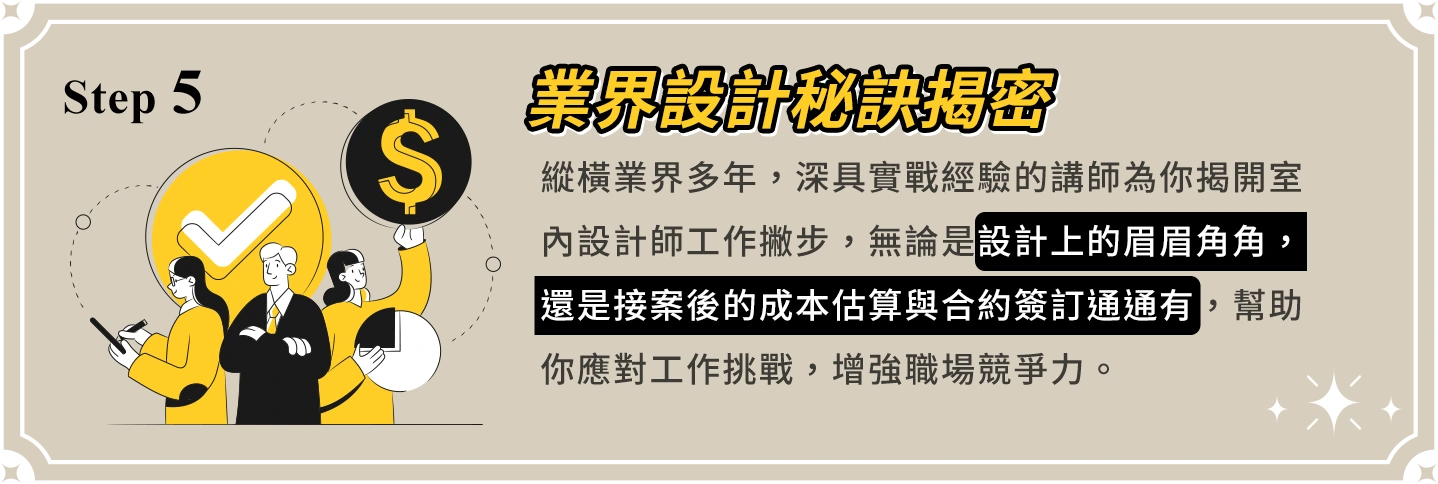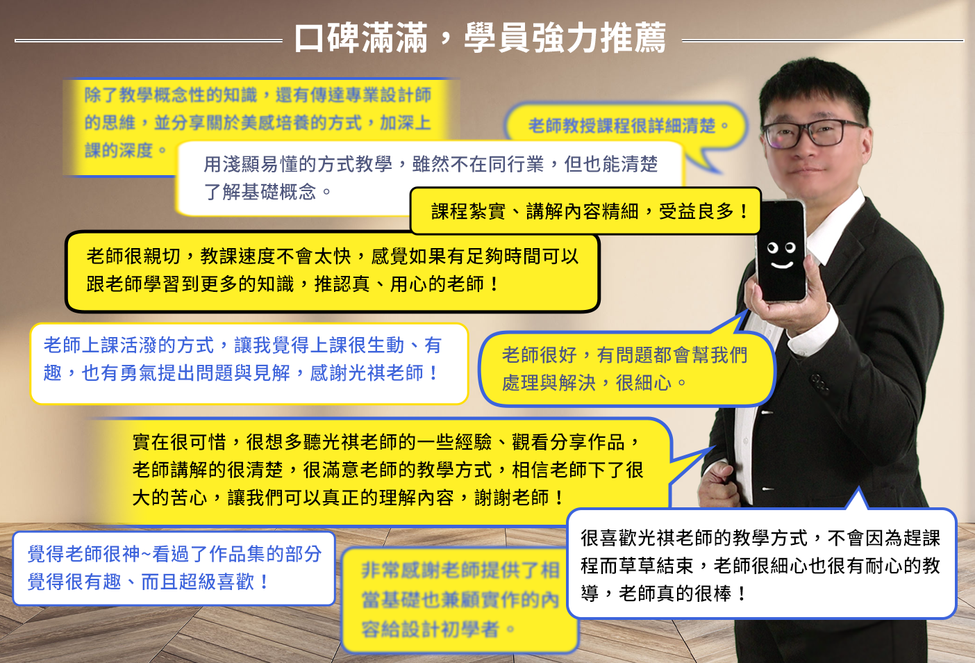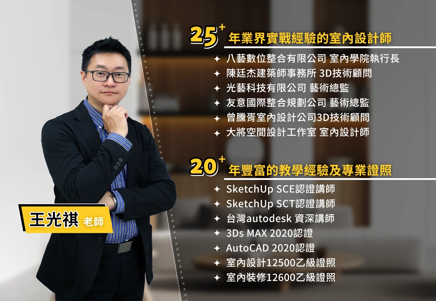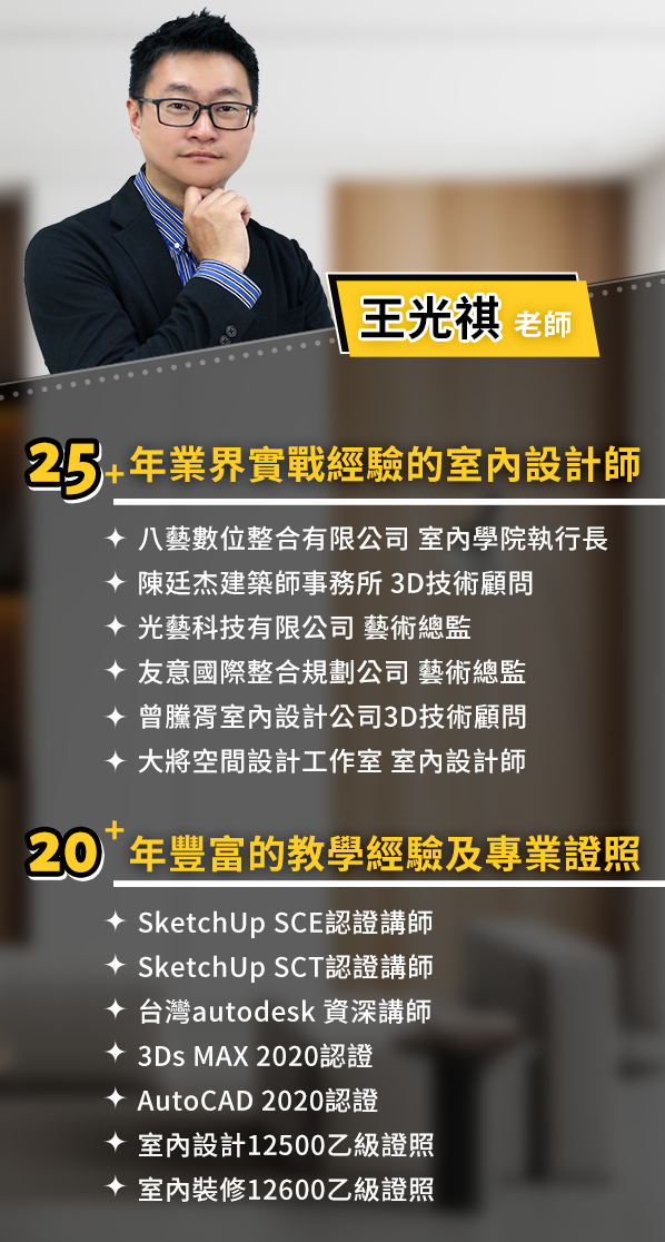 王光祺老師從事室內設計工作超過20年,擁有3Ds MAX和AutoCAD原廠認證、室內設計乙級證照、室內裝修乙級證照等多項專業證照,並擔任多家室內設計公司3D技術顧問及藝術總監!憑藉豐富的業界經驗和幽默生動的教學風格,深受學生喜愛。