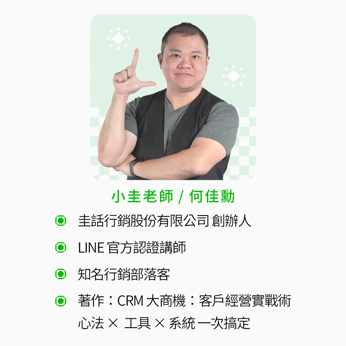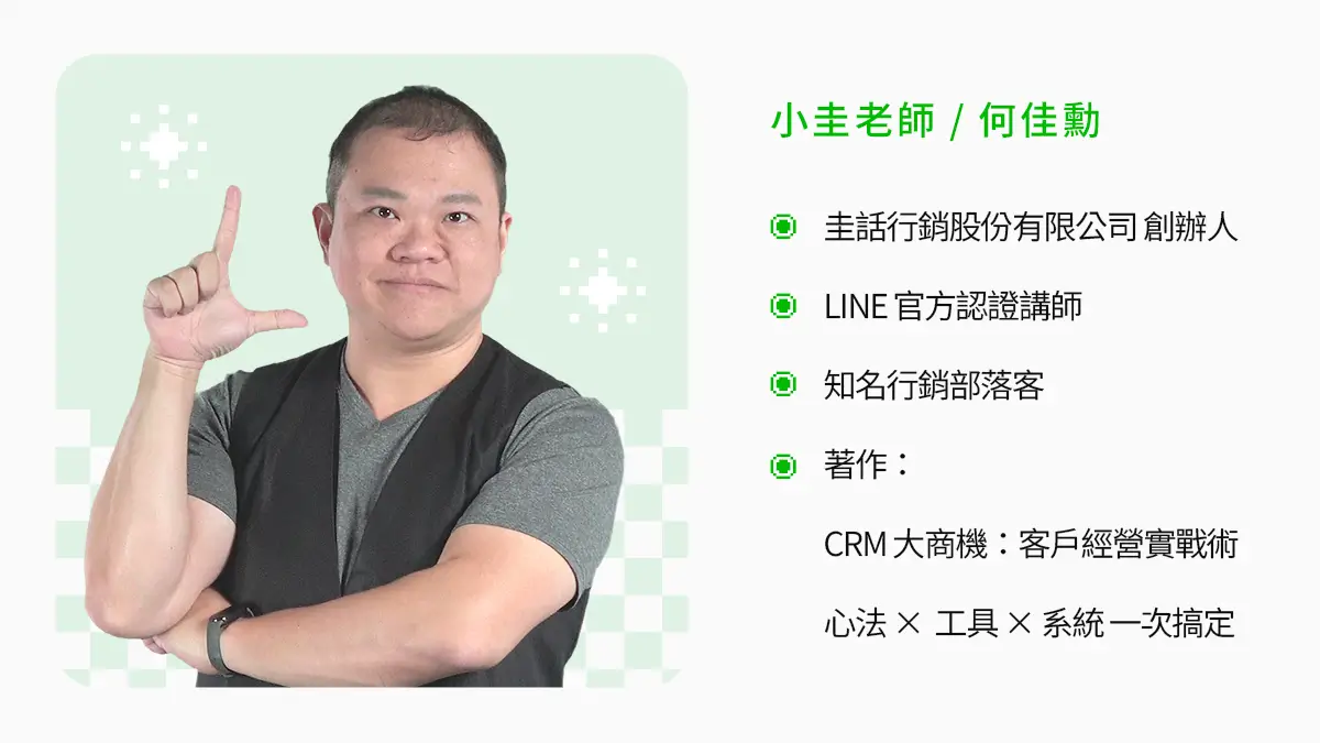小圭老師擅長以「遊戲化」的方式進行行銷教學,讓枯燥的理論變得有趣易懂 。他每年進行超過 200 場的行銷演講,並陪伴上百家品牌找出成長解方 。作為 LINE LAP 廣告的實戰專家,他不僅熟悉平台操作,更深諳如何透過數據與 AI 工具來提升廣告成效,是帶領學員進入 LINE 廣告領域的最佳導師。