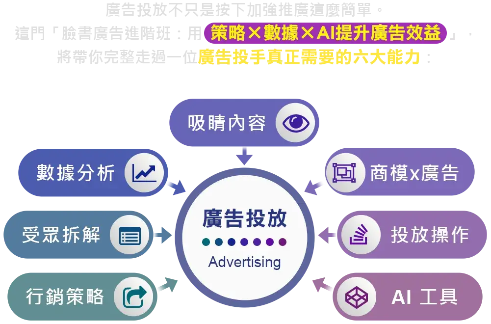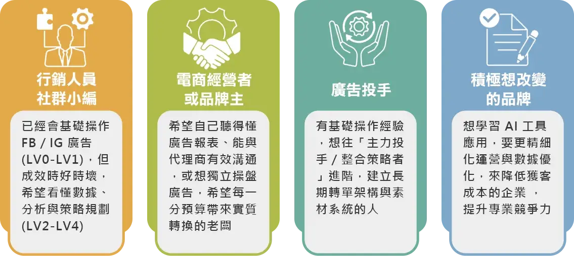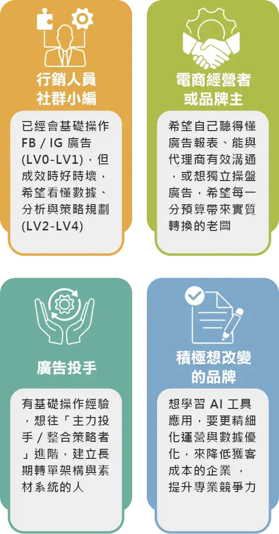 AI 更改變了廣告投手的工作方式,早一步學會使用 AI 幫你找受眾、寫標題、想活動,你就能把時間留給更有價值的策略思考與溝通,無論你是為了提升職場技能,還是為了自家生意的成長,這門課都將是你投資回報率最高的一筆投入。