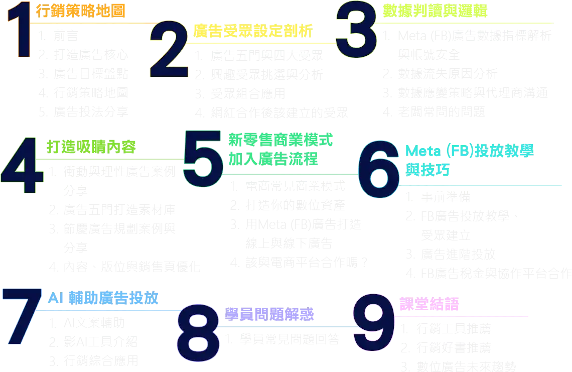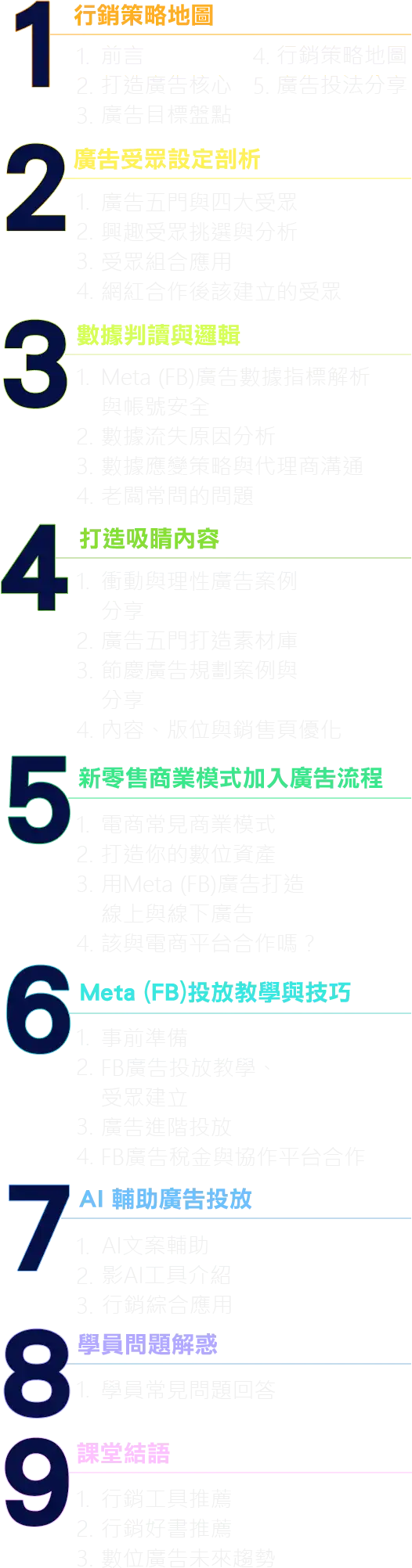 本課程,透過實際案例與表單工具,帶你拆解業績影響的因子,從促銷方案、檔期規劃、素材呈現、受眾分群到會員回購,提出解決方案,這是一門讓你拿回廣告主導權,將預算轉化為實質營收的必修課,教你如何用數據說服老闆,也說服自己!
