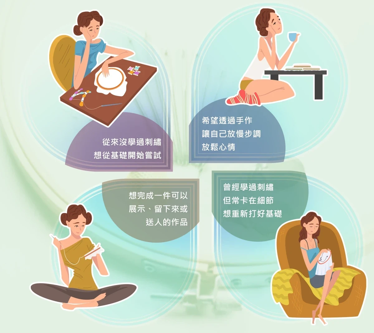 刺繡之所以讓人停下來,往往不是不喜歡,而是不知道該怎麼開始、怎麼選、怎麼繼續。這門課先幫你把最容易卡住的地方理清,讓你願意真正動手。