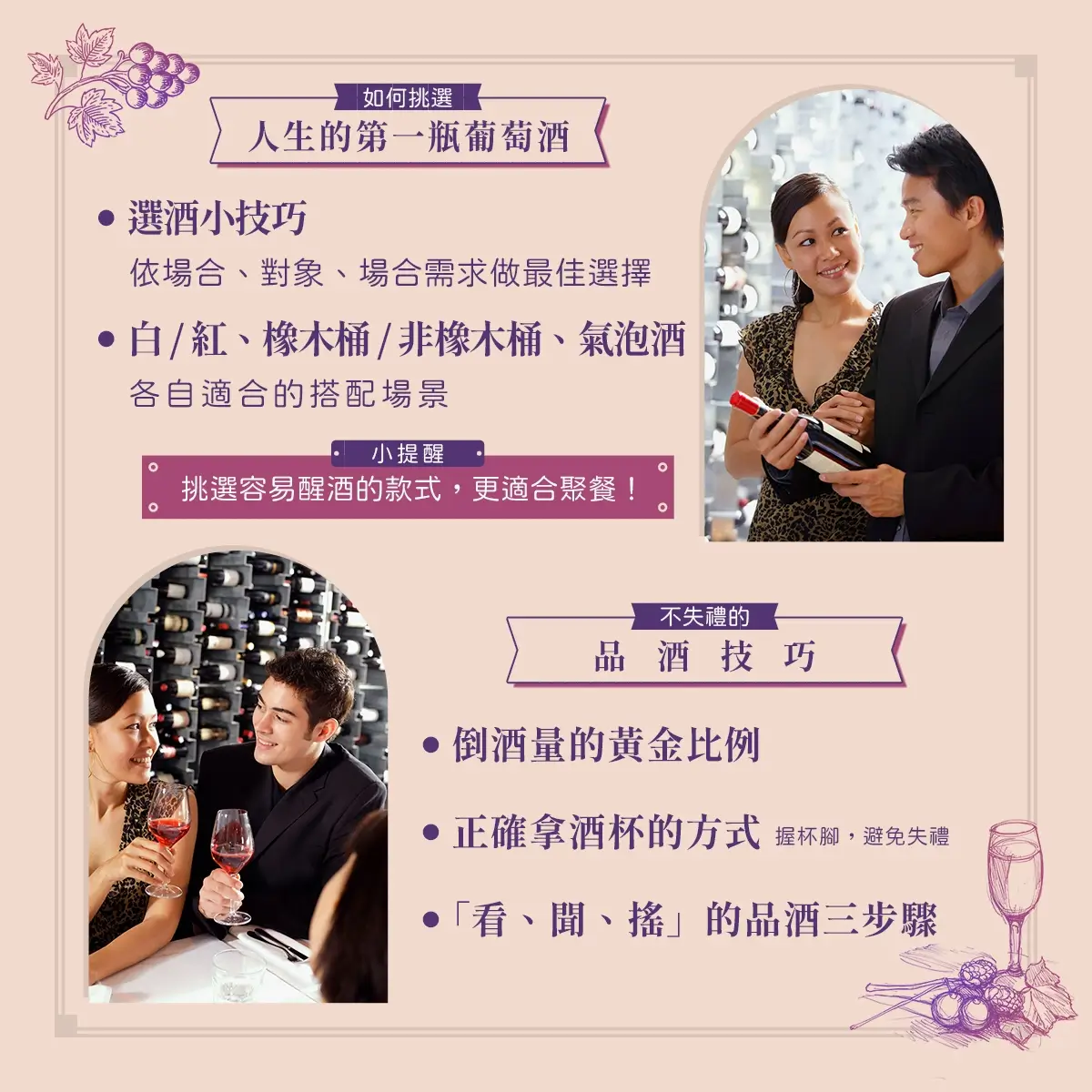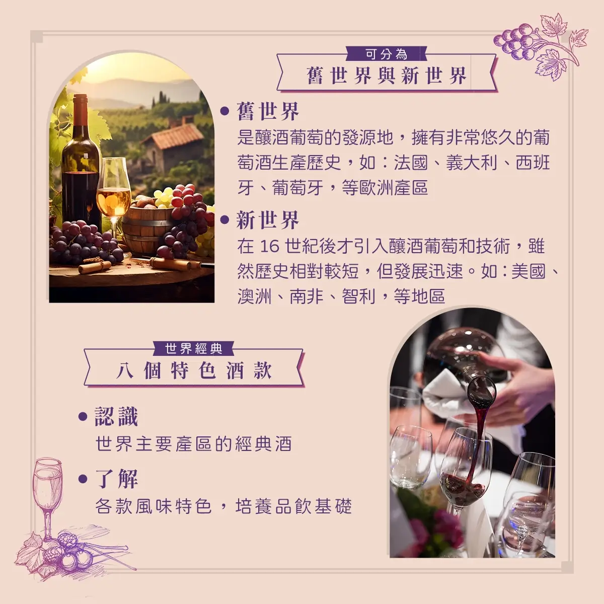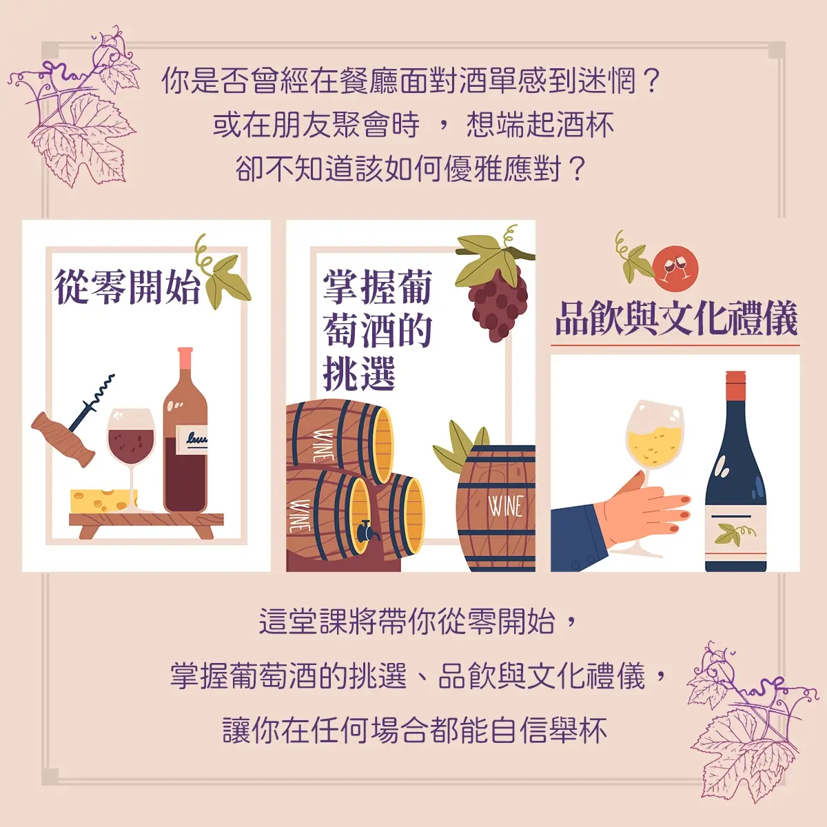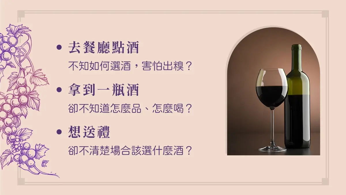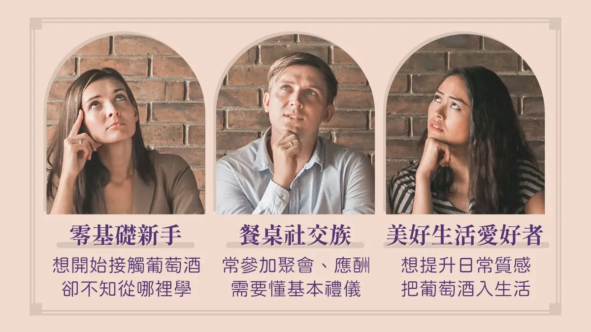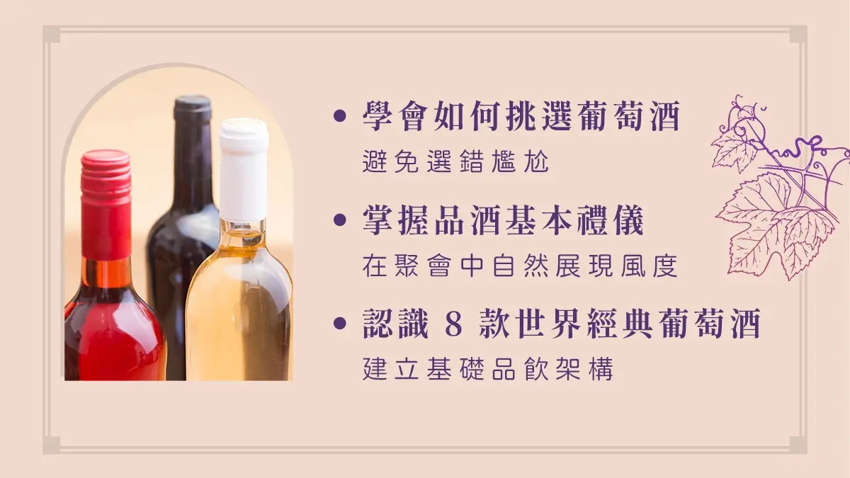 葡萄酒不只是一杯酒,更是種讓日常變更美好的生活方式。五堂課從酒款風味、選酒技巧、經典葡萄品種,到家常料理搭配、療癒晚餐、美好聚會時刻,都替你準備好完整指南,將帶你用味覺探索生活的可能,適合想增添生活儀式、享受片刻微醺療癒的你,一次擁有最溫柔的葡萄酒提案。