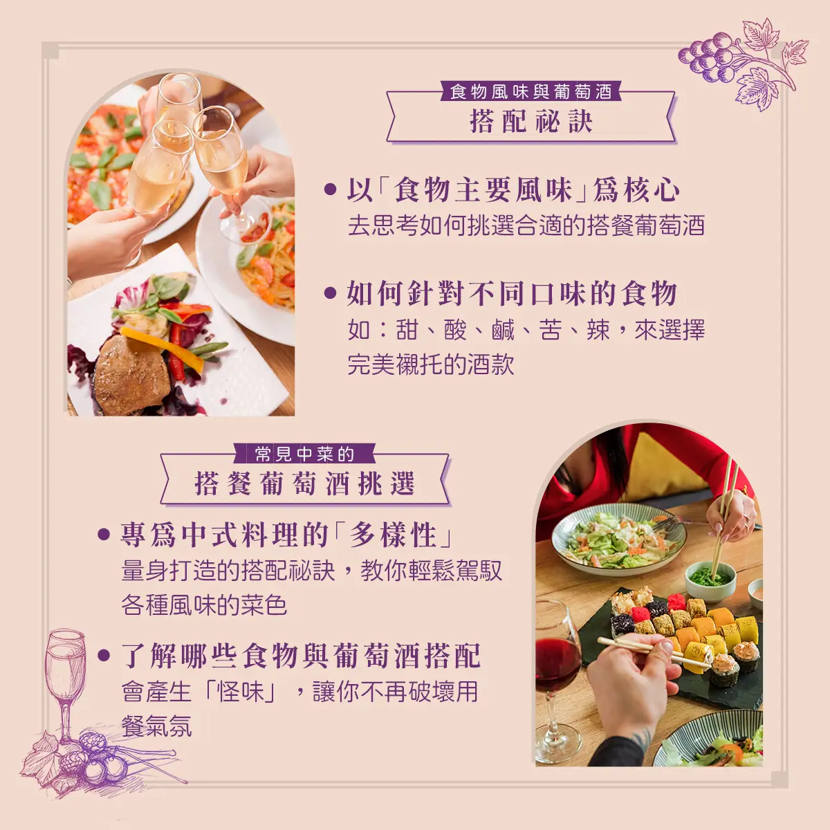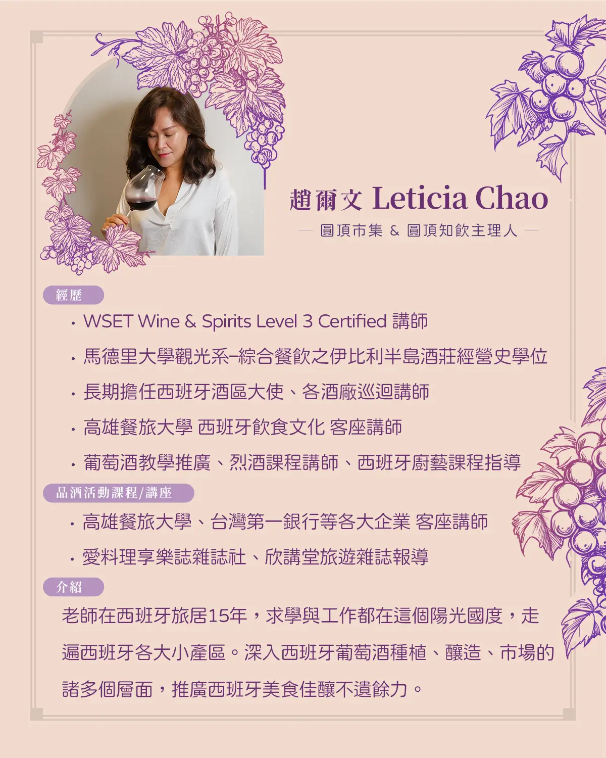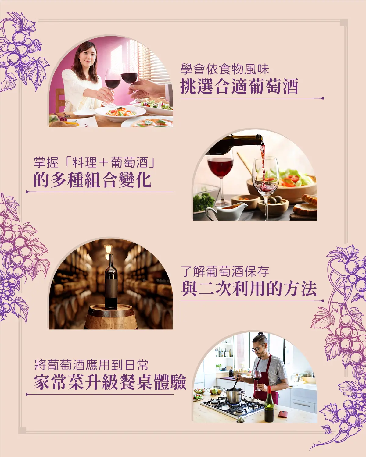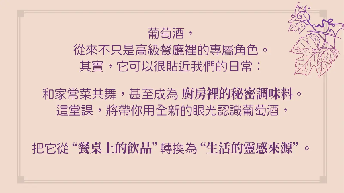 葡萄酒不只是一杯酒,更是種讓日常變更美好的生活方式。五堂課從酒款風味、選酒技巧、經典葡萄品種,到家常料理搭配、療癒晚餐、美好聚會時刻,都替你準備好完整指南,將帶你用味覺探索生活的可能,適合想增添生活儀式、享受片刻微醺療癒的你,一次擁有最溫柔的葡萄酒提案。