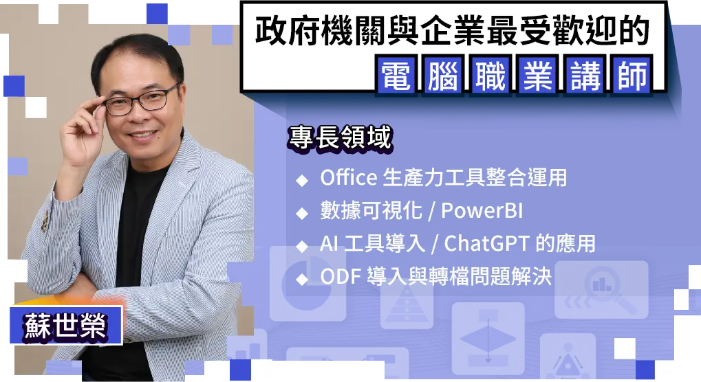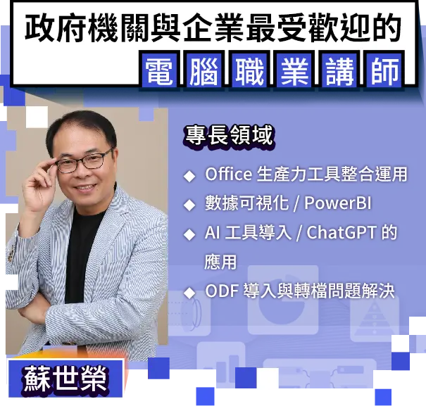 擅長將 Office 軟體、數據視覺化、VBA 自動化、文件整合運用、AI 工具導入等複雜技巧,拆解成人人都能上手的實用步驟。曾受邀於政府機關、公部門、大專院校與知名企業授課,合作機構包括總統府、公務人力發展中心、台積電、BenQ、台灣大學、中央大學等。教學以實務案例為導向,教的不是理論、而是能馬上用的技能,幫助你提升工作效率與數位應用力。