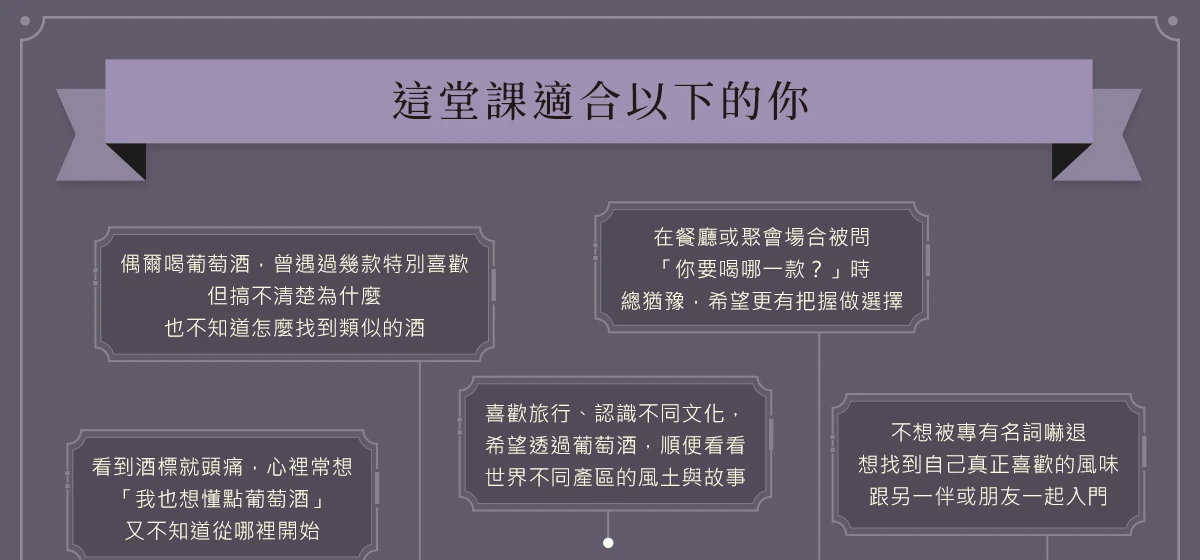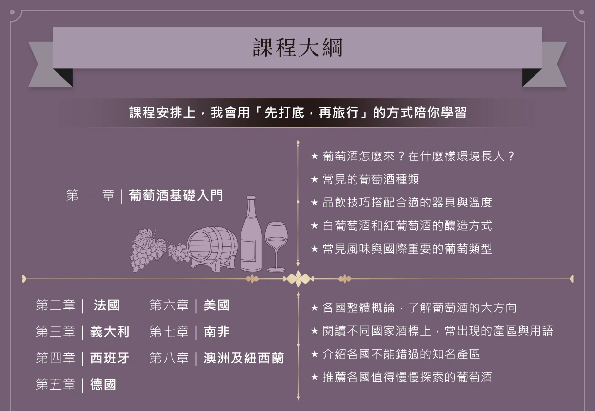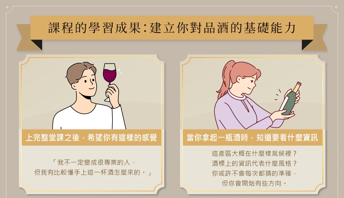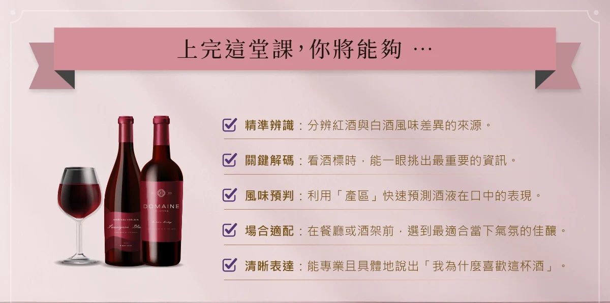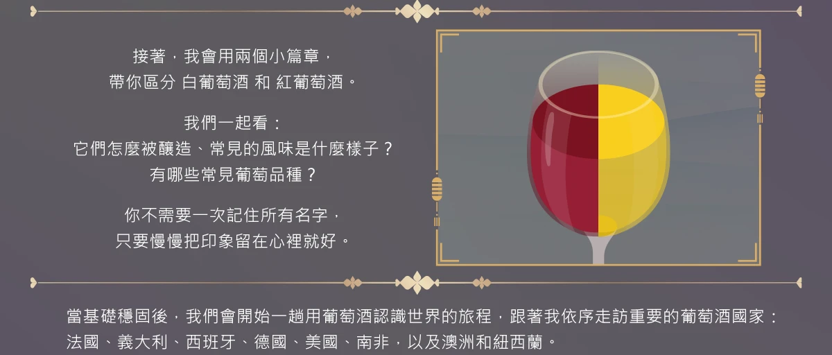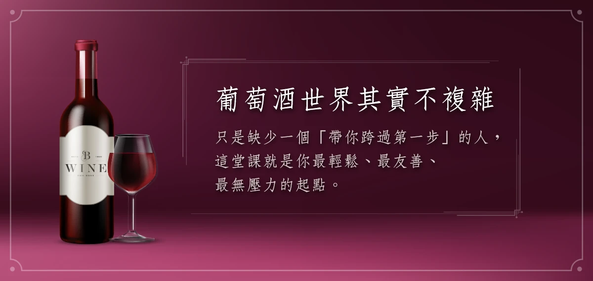 在這堂課,我最在意的事情是,讓你覺得「葡萄酒是可以慢慢學、慢慢喜歡的」,而不是遠遠看著的世界,所以我會盡量清楚、有條理,又不急躁的方式陪你走,用生活的例子來說,讓你比較容易連結,讓我們先把葡萄酒基礎打穩,再慢慢往不同國家和產區延伸。