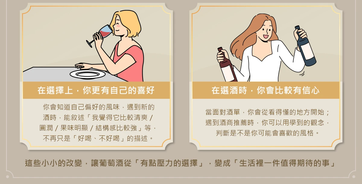 學葡萄酒,不只是為了「變得很厲害」,更多時候,是為了讓自己的生活多一點選擇、多一份自在。以後在餐廳點酒、在旅行中逛到酒商、想幫朋友或自己買一瓶酒時,你會比較知道該怎麼看、怎麼問、怎麼選。
