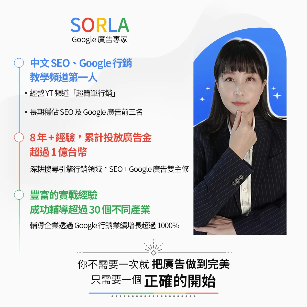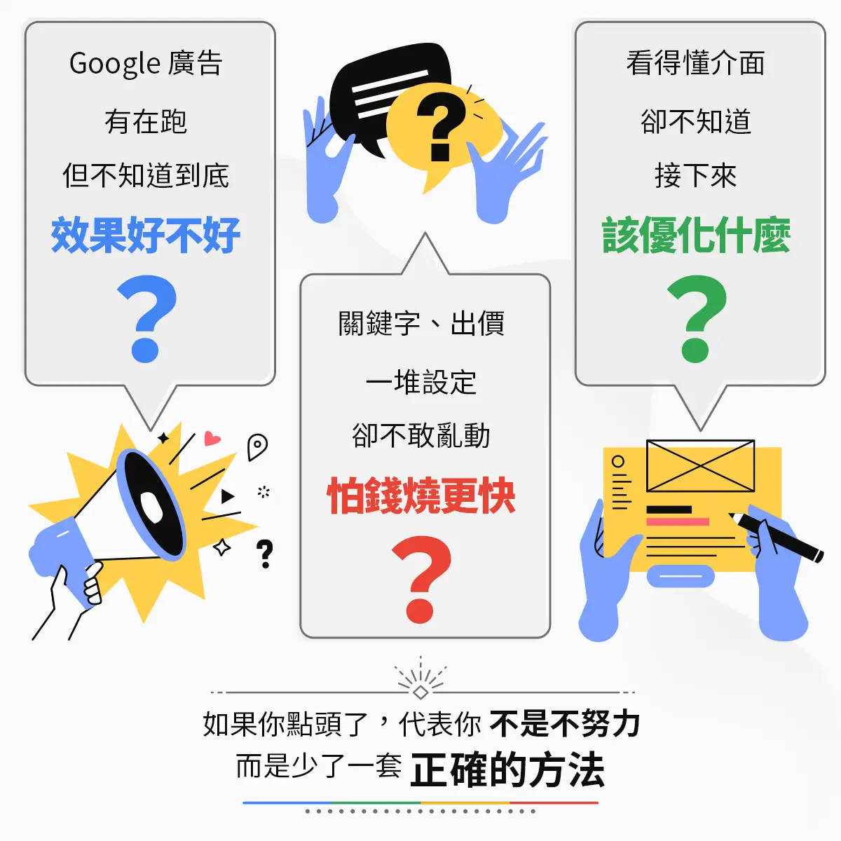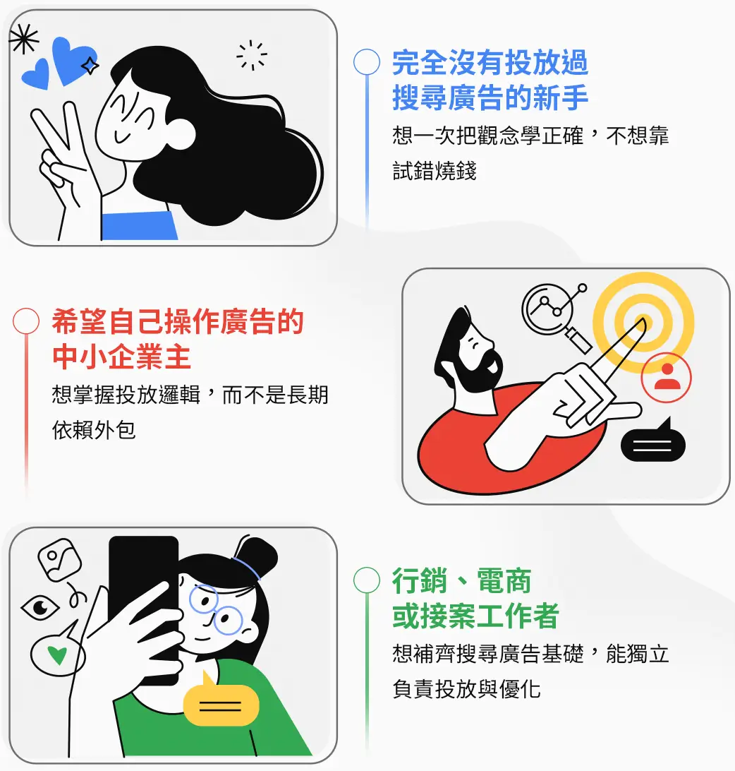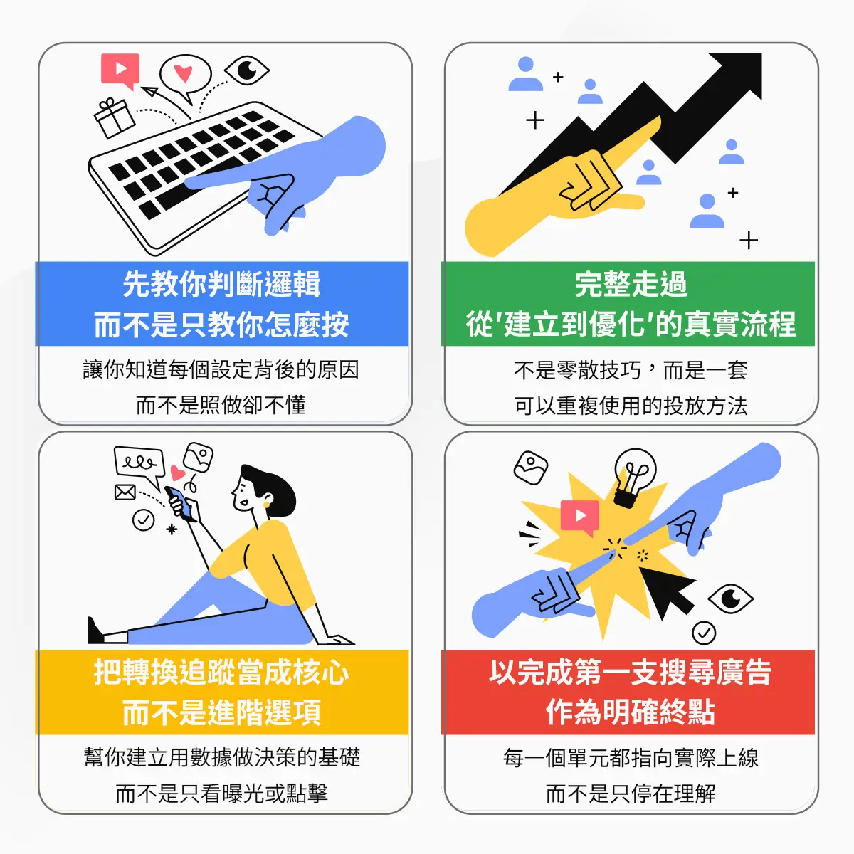 這門課是為了「想真正學會 Google 搜尋廣告,而不是只會照教學操作」的人設計的。整個課程會依照實際投放流程,帶你從零開始,建立一套可以追蹤成效、持續優化的搜尋廣告系統。